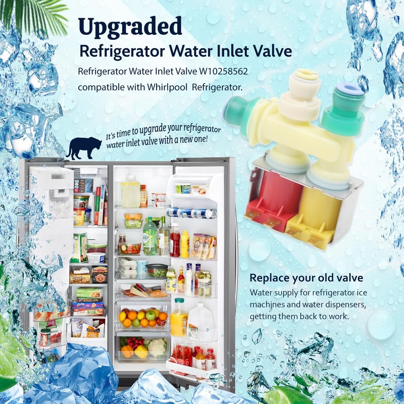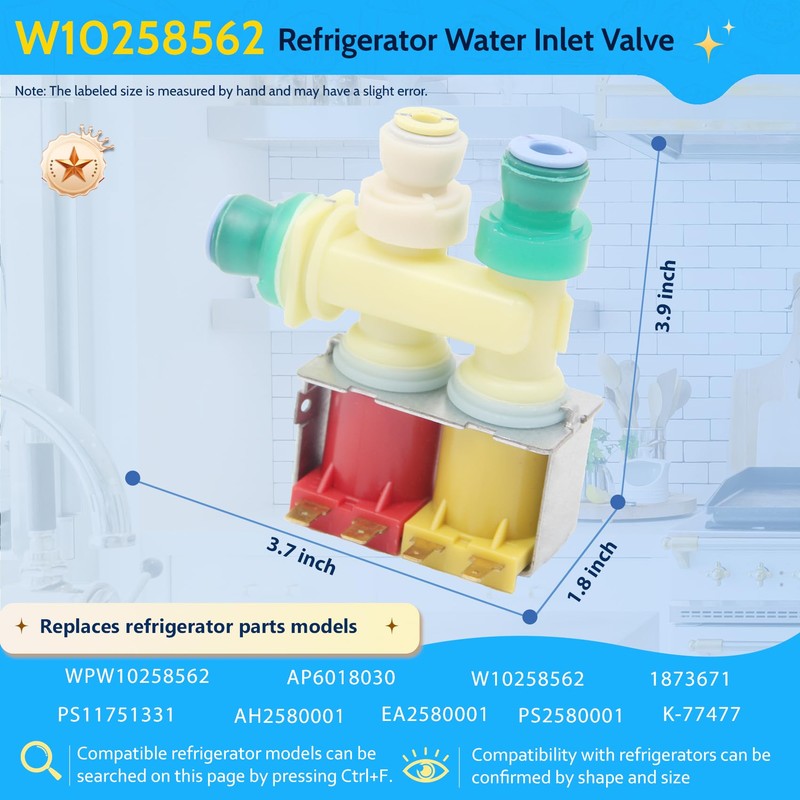 - ✅W10258562 refrigerator water inlet valve, made of high quality and clean direct drinking water grade valve liner material, direct replacement for WPW10258562, AP6018030, W10258562, 1873671, PS11751331, K-77477, AH2580001 EA2580001 PS2580001.