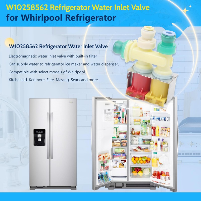 - ✅ Part Name No: W10258562 Refrigerator Water Inlet Valve, used to replace Whirlpool refrigerator water inlet valve, solenoid water inlet valve with built-in strainer to supply water to refrigerator ice maker and water dispenser, compatible with some models of Whirlpool, Kitchenaid, Kenmore Elite, Maytag, Sears and other brands of refrigerators.