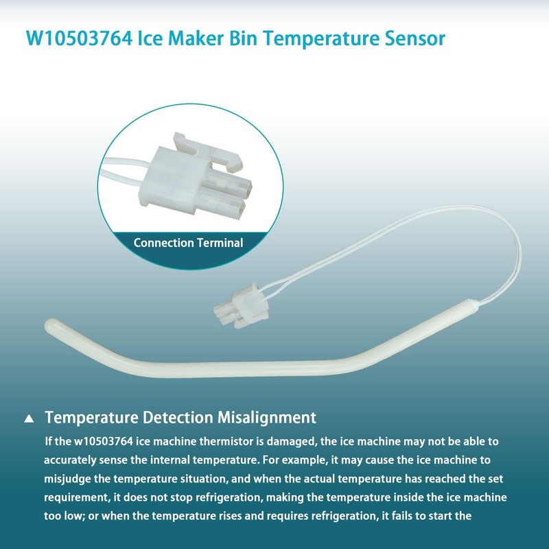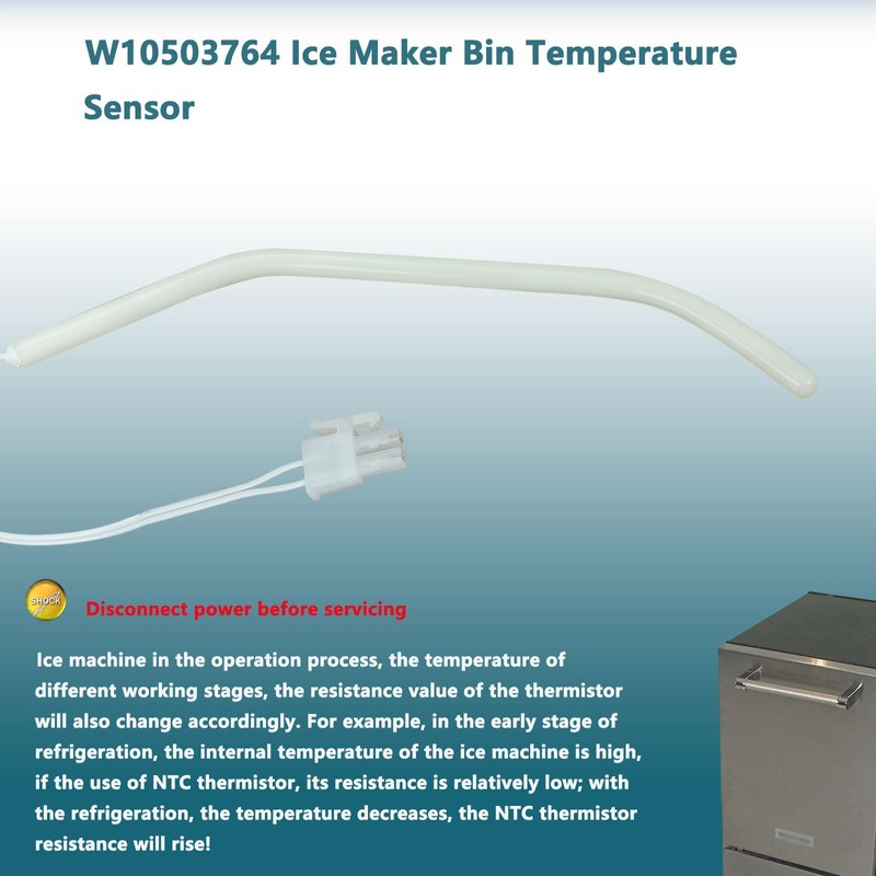 • W10503764 Ice Maker Bin Temperature Sensor WPW10503764 Direct replacement for Whirlpool ice maker thermostat ,This temperature sensor maintains optimal bin temperature at 15°F (-9°C), preventing ice melting and clumping for crystal-clear cubes.