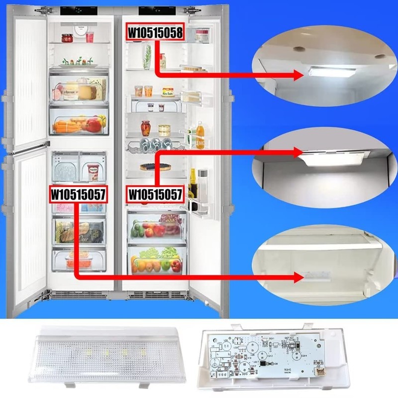 Some refrigerator has three lights, one main ceiling LED light and two auxiliary LED light on the rear panel, if the main light is not on, you should first replace the main light W10515058 and then replace the refrigerator light W10515057, otherwise the W10515057 may be shorted and burned.
