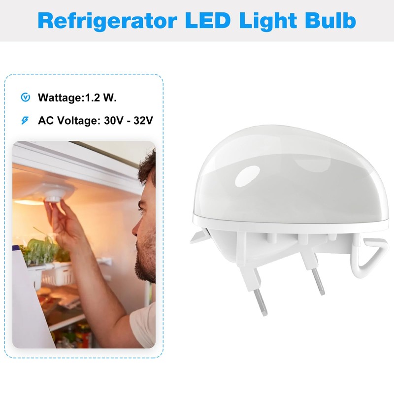 - 【Refrigerator LED Light Bulb】Whirlpool refrigerator light bulb 30V - 32V, Wattage: 1.2 W. LED bulb attaches inside the cabinet and illuminates the inside of the refrigerator or freezer.