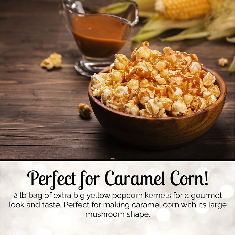 - LARGE BAG: When made in the Whirley Pop Stovetop Popper, our 2-pound bag of old-fashioned, Extra-Large Caramel popping corn kernels makes approximately 8 six-quart batches of flavorful popcorn.