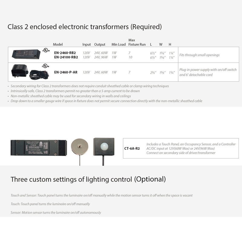 - 24V remote and plug-in Transformers (sold separately). 60 watt remote transformer: en-2460-rb2, 100 watt remote transformer: en-24100-rb2, plug-in transformer: en-2460-p-ar