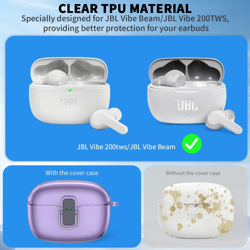 The security locks clear case cover specially designed for JBL Vibe 200TWS/JBL Vibe Beam, no need to take off the case to charge.Feature:✔Transparent appearance to show off the original pretty of your earbuds✔Fits the JBL Vibe Beam/JBL Vibe 200TWS✔Made of high-quality hard TPU material,Protects your earbuds charging case against bumps, drops and scratches,etc✔With a metal solid carabiner, easy to carry and convenient to attach to backpack and belt, etc✔Convenient Double-head hidden design cleaning kit, cleaning pen will meet the cleaning needs of many situationsSpecificationsMaterial: Transparent TPUCompatible with: Case cover for JBL Vibe 200TWS/JBL Vibe BeamWhat You Will Get?1x Clear Case Cover1x Carabiner1x Cleaning Pen Kit