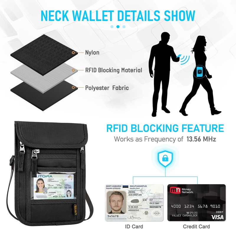 - Security; RFID blocking technology protects your passport, credit cards and personal information from identity theft. Equipped with RF shielding material blocks unwanted scans and ensures that your cards and personal information remain private.