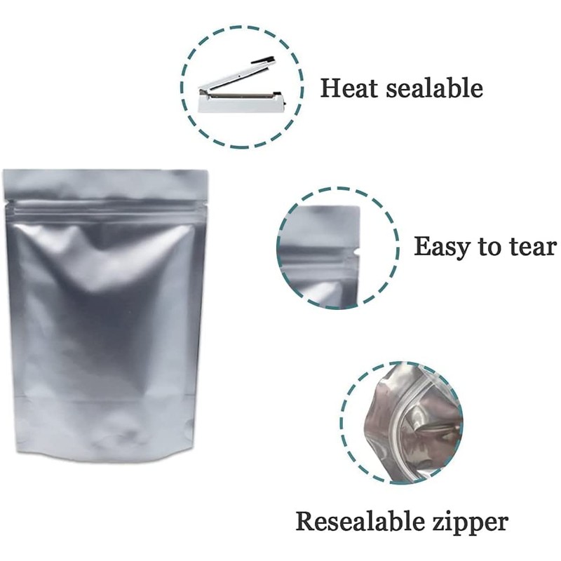 WACCOMT Pack 50 Pieces Silver Pure Mylar Foil Bags Smell Proof Stand Up Pouch 3.94mil Thick Aluminium Foil Zipper Lock Pouches Resealable Food Storage Bag for Zip Snack Lock Heat Seal (6.3x9.4 inch)