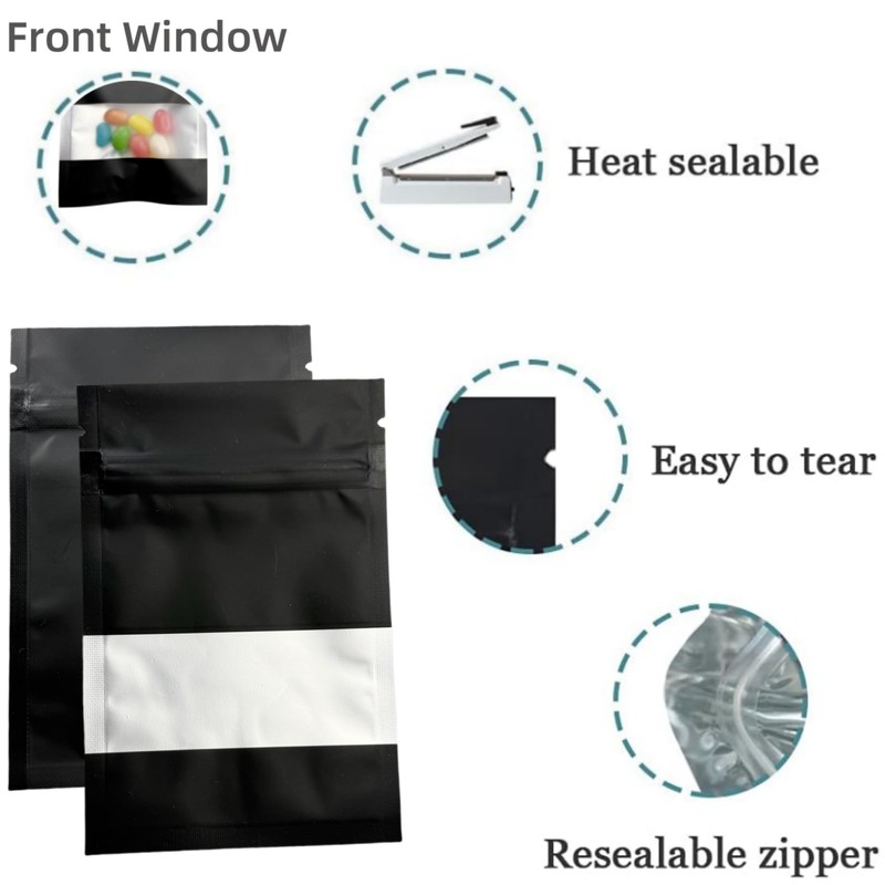 WACCOMT Pack Pack of 100 Matte Aluminium Foil Resealable Bags with Clear Window, Heat Sealable Mylar Zip Lock Bags for Storage (Matt Black, 8 x 12 cm (3.1 x 4.7 inches))