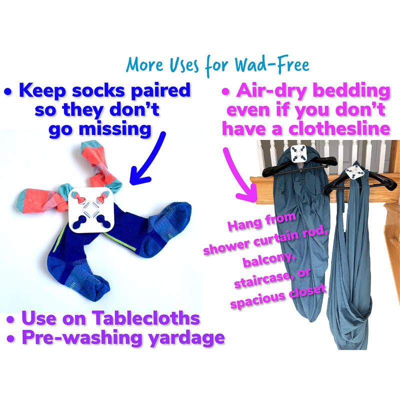- Also suitable for tablecloths, pre-washing fabric yardage for sewing or crafting, and pairing socks so they don't get lost. Wad-Free also aids air-drying bedding, even if you don't have a clothesline: just wash with Wad-Free for cleaner sheets, then hang from the base indoors. We also have a heavy-duty version available called Wad-Free for Blankets & Duvet Covers intended for those items.
