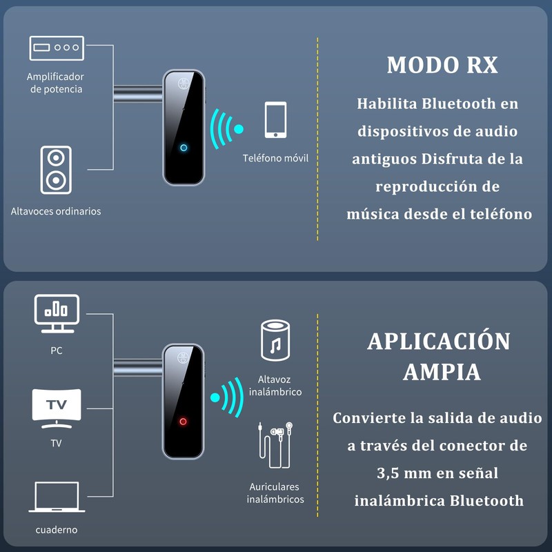 - 🎼 【2 modos & Amplia Compatibilidad】El adaptador inalámbrico admite transmisión y recepción de Bluetooth, es decir, los modos TV y RX. El adaptador Bluetooth no es sólo un receptor Bluetooth 5.3, sino también un transmisor Bluetooth. Utilizando el adaptador Bluetooth auxiliar en modo receptor, el dispositivo con cable puede reproducir música desde el teléfono móvil; en modo transmisor, el dispositivo Bluetooth puede recibir sonido del dispositivo con cable. Compatible con ordenadores, televisores, proyectores (modo de transmisión)/altavoces, auriculares (modo de recepción).