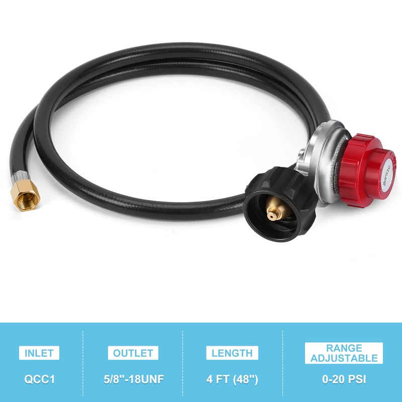 - 🔥Propane Regulator: Output pressure 0-20 PSI adjustable with 4 Feet long hose. Fits with Type 1(QCC1) propane tank connections & 5/8"-18 UNF outlet connection.