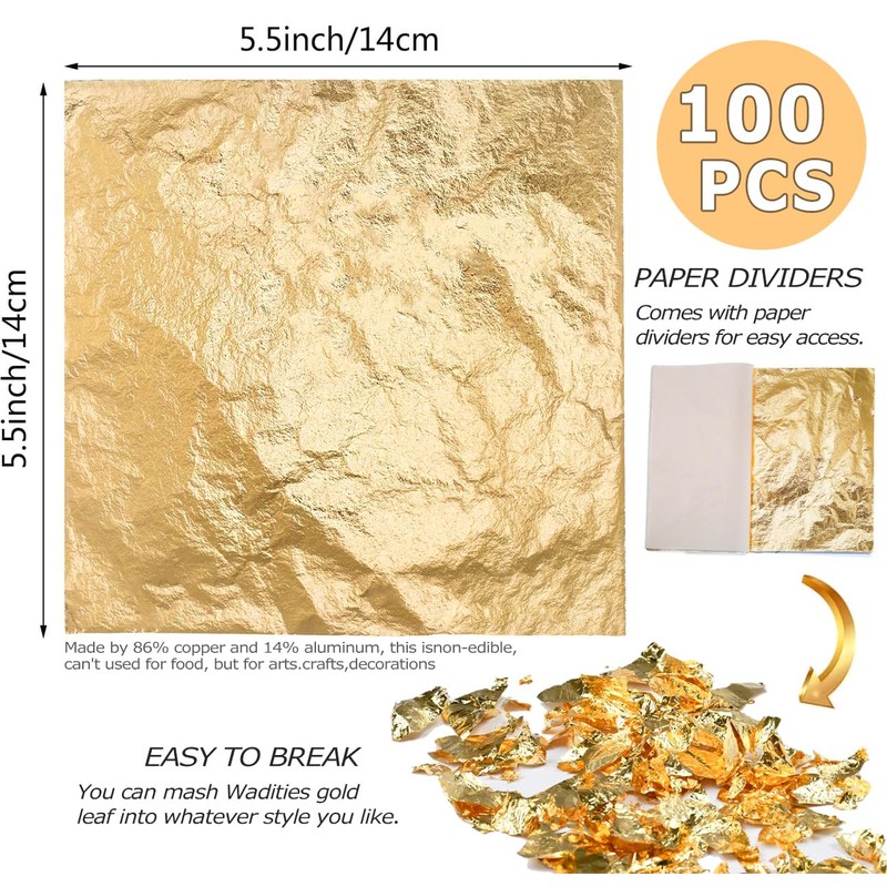 Wadities 100pcs Imitation Gold Leaf Sheets, 14 x 14 cm Gold Foil Multipurpose Gold Leaf for Nail, Art & DIY Project, Picture Frame, Home Wall, Interior and Multi Artistic Decoration