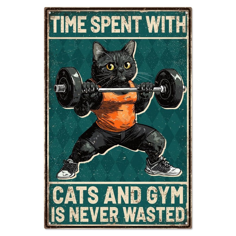 - Easy installation: our time with cats and in the gym is never wasted metal tin sign provides great comfort when using. It comes complete with 4 pre-drilled mounting holes, making wall mounting a breeze, door, or wood surface with screws, nails, nuts, bults or command strips. With its easy to use hanging function, you can quickly decorate your room and enjoy the fun and charm it brings with it