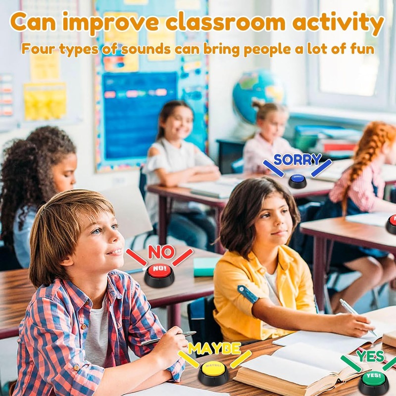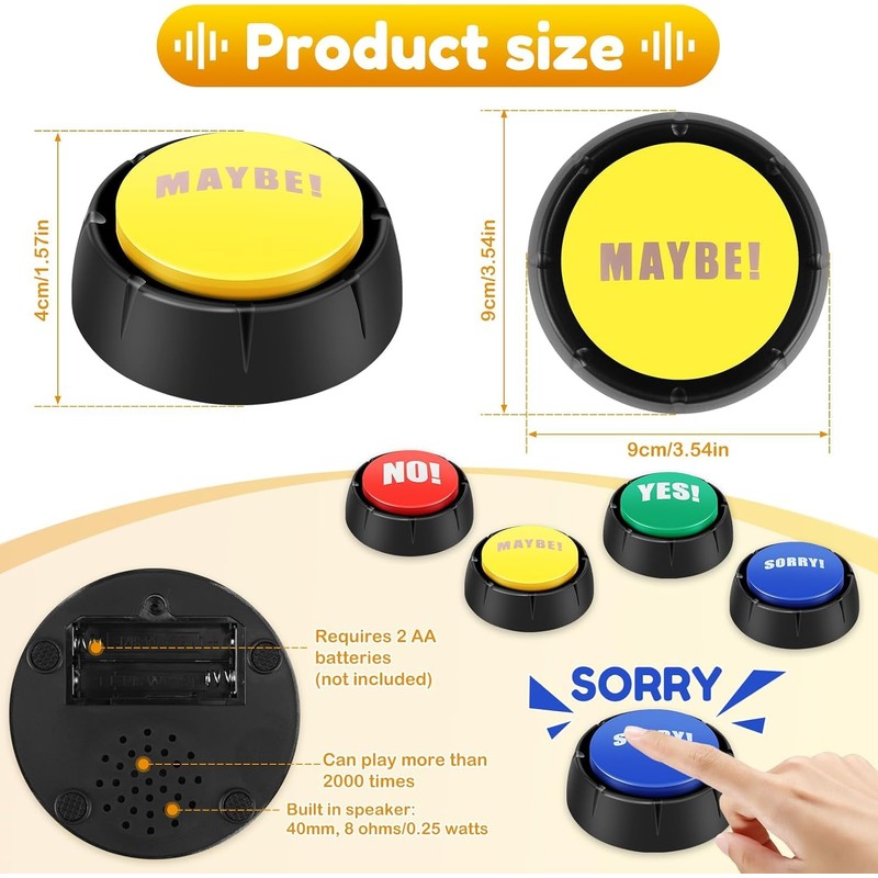 - What You Get: Inside the set there are 4 buttons with sounds, printed with green "YES!", blue "SORRY!", yellow "MAYBE! ", red "NO!", which can bring a lot of fun. Bring some joy to your home with these cute sound buttons, they require 2 AA batteries (not included).