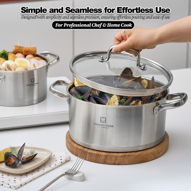WAGENSTEIGER 7.27-Quart Dutch Oven, Stainless Steel 3-Layer Construction with Aluminum Core, Tempered Glass Lid, Spacious Stock Pot for Boiling, Stewing, Canning – For All Stovetops (9.84" Diameter)