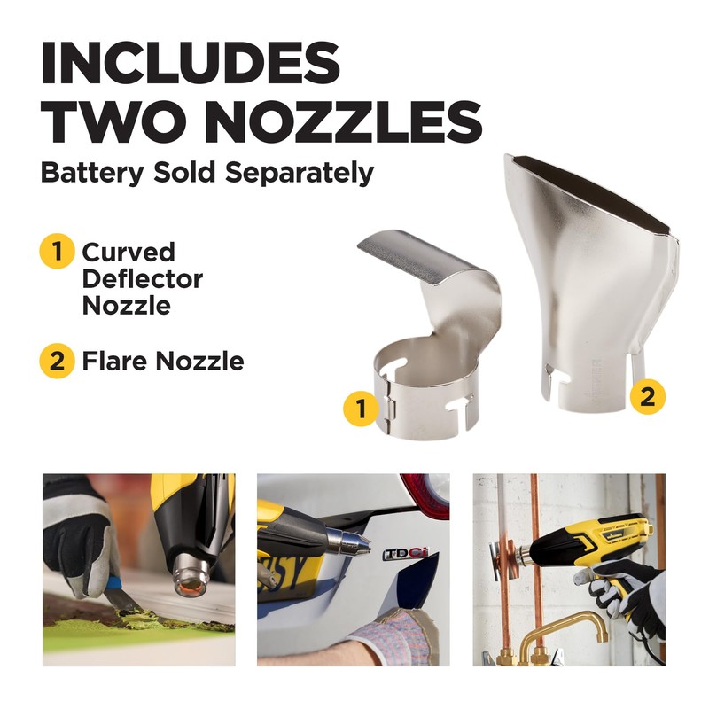 - INCLUDES TWO NOZZLES: The heat gun includes two nozzles to help complete your projects. Use the glass protector to protect glass surfaces from direct heat while using the gun. Use the flare nozzle to distribute heat across a long, narrow area