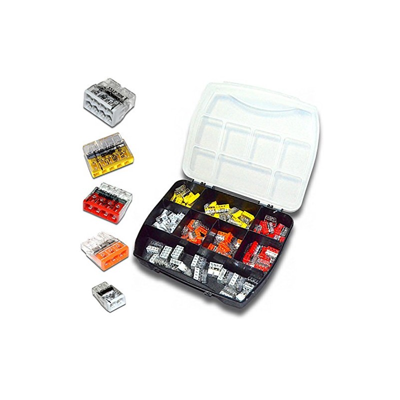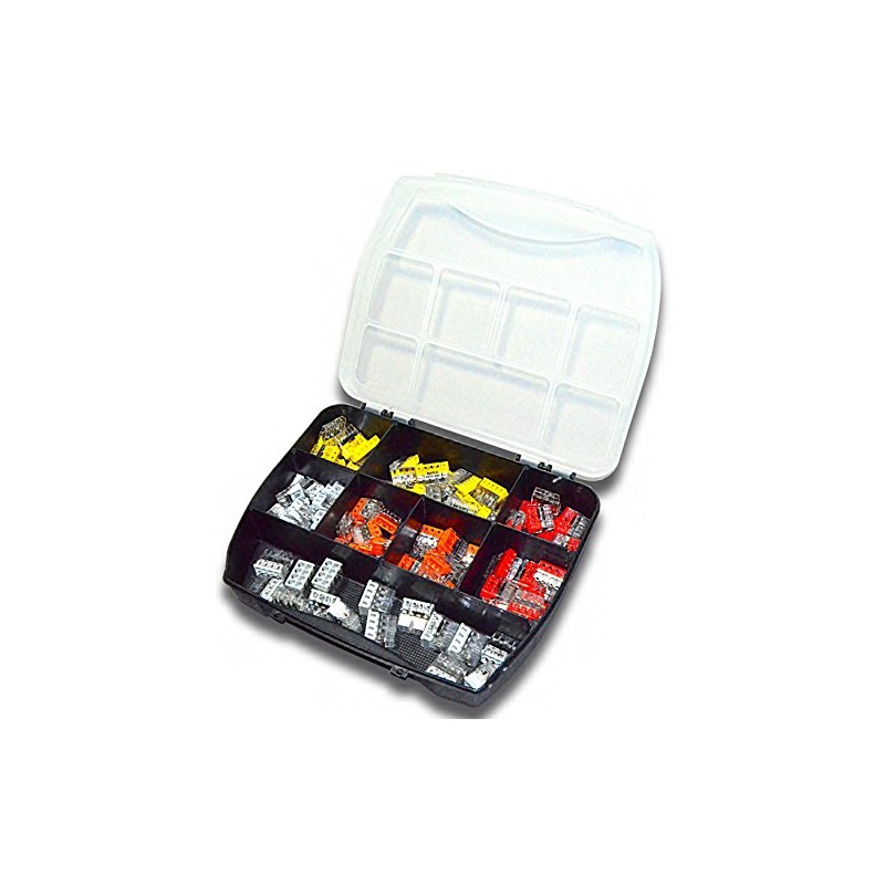 The Wago clamps are available in a practical plastic box with 8 compartments (dimensions approx. 19 x 16 x 3.5 cm) with snap-in transparent lid.