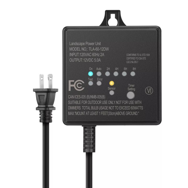 Transformador de bajo voltaje para exteriores DEWENWILS 60W 120V AC a 12V DC con temporizador y sensor de luz de fotocélula, resistente a la intemperie, especialmente para iluminación LED de paisaje, foco, luz de camino, listado ETL