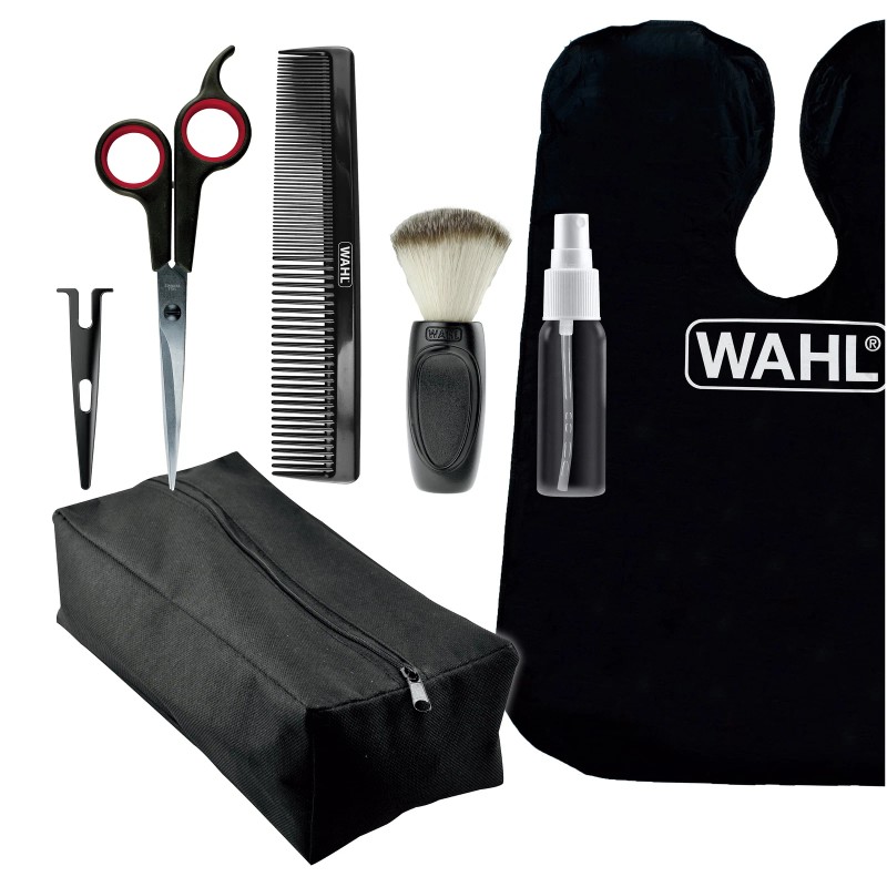 Wahl Unisex Haircutting Accessory Combo Kit for an at Home Barbering Experience with Wahl’s Most Popular Accessories – Model 3572. Description - The Wahl haircutting accessory combo kit allows for an at-home barbering experience. This 6-piece kit includes Wahl’s most popular accessories. First are the premium barber shears with their blade cover, this allows you to cut excess hair off your head during your haircuts. These sharp scissors will cut anything you missed with the clippers. The large nylon barber’s cape included in this kit will ensure that you won’t get any of your cut hairs on your body during your haircut. The premium styling comb will help straighten your hair before your haircut and helps remove excess cut hairs during the haircut. The neck duster with soft bristles will help you remove any excess cut hairs from your head, neck, ears, and barber’s cape during your haircut. The last piece in this kit is the water spray bottle, use this to help aid with your haircuts.