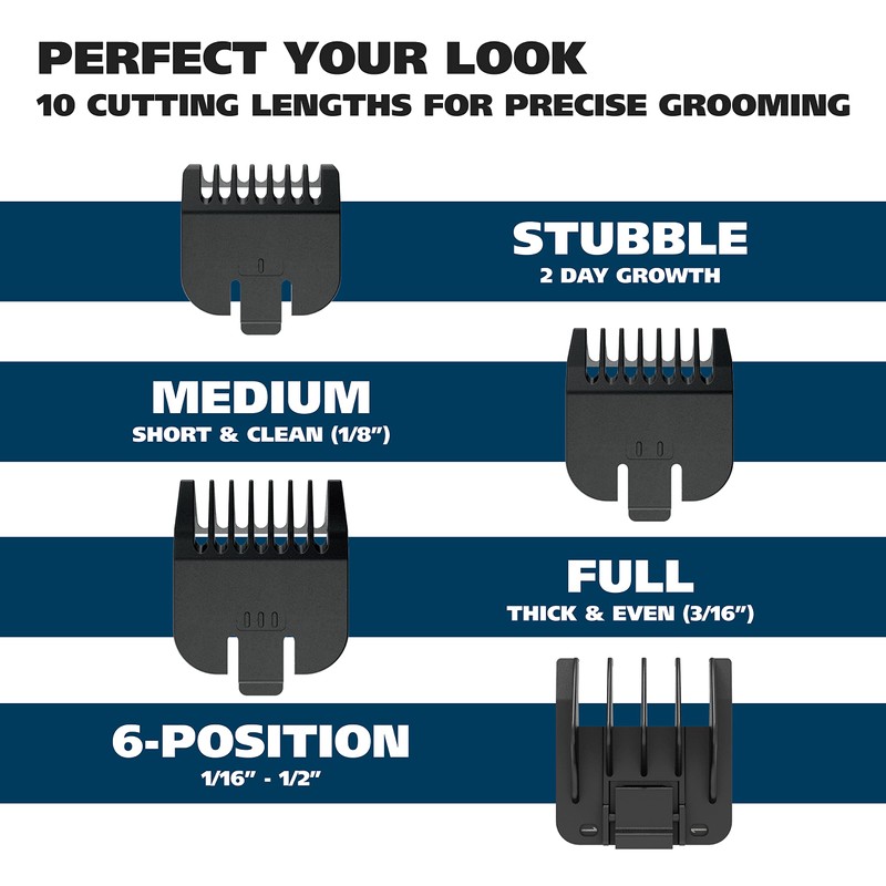 - 10 Cutting Lengths - Achieve a range of beard styles with 10 different beard trimming lengths from 1/8” to ½”; include stubble (1/16) , medium (1/8”) , and full guard (3/16”) in addition to a 6 position guide (1/16” to ½”)