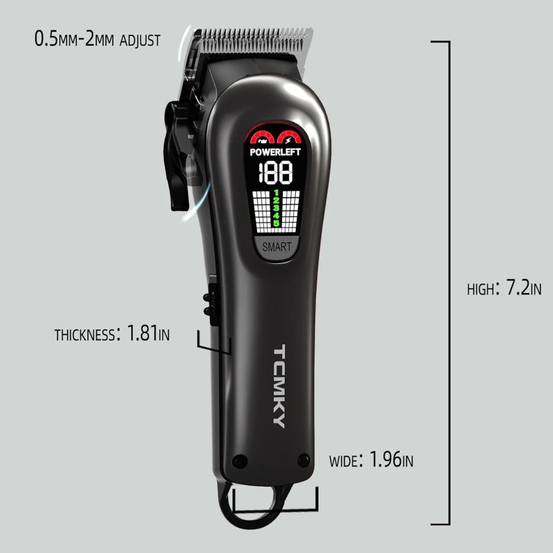 - Professional Hair Clipper&LED Display TCMKY Professional Hair Clipper which can display the remaining power,charging reminder indicator and Blade lubrication reminder indicator. Our ultra-high definition LED display provides you with all information to ensure that you use it correctly. In addition, it includes a full size guide comb to meet your need for trimming your head and face. Due to its low noise and safety blade it is also suitable for children or young children to have a haircut