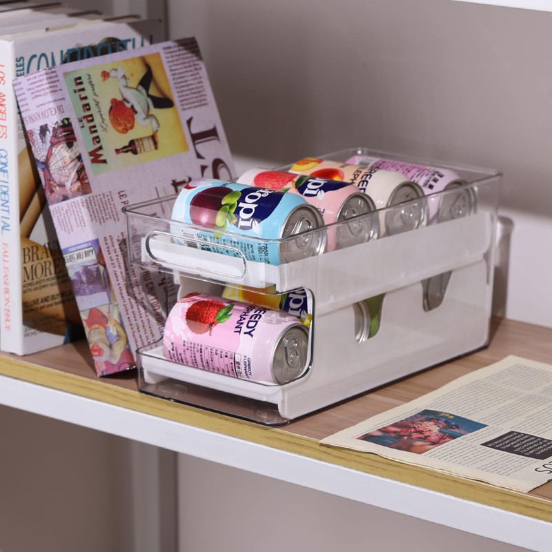- Wenn Sie die Dose aus der unteren Schicht herausnehmen, rollt die Dose auf der oberen Schicht automatisch zum Nachfüllen herunter, was sehr bequem und leicht zugänglich ist