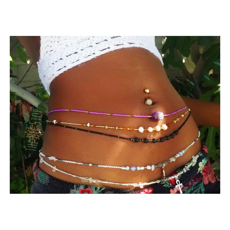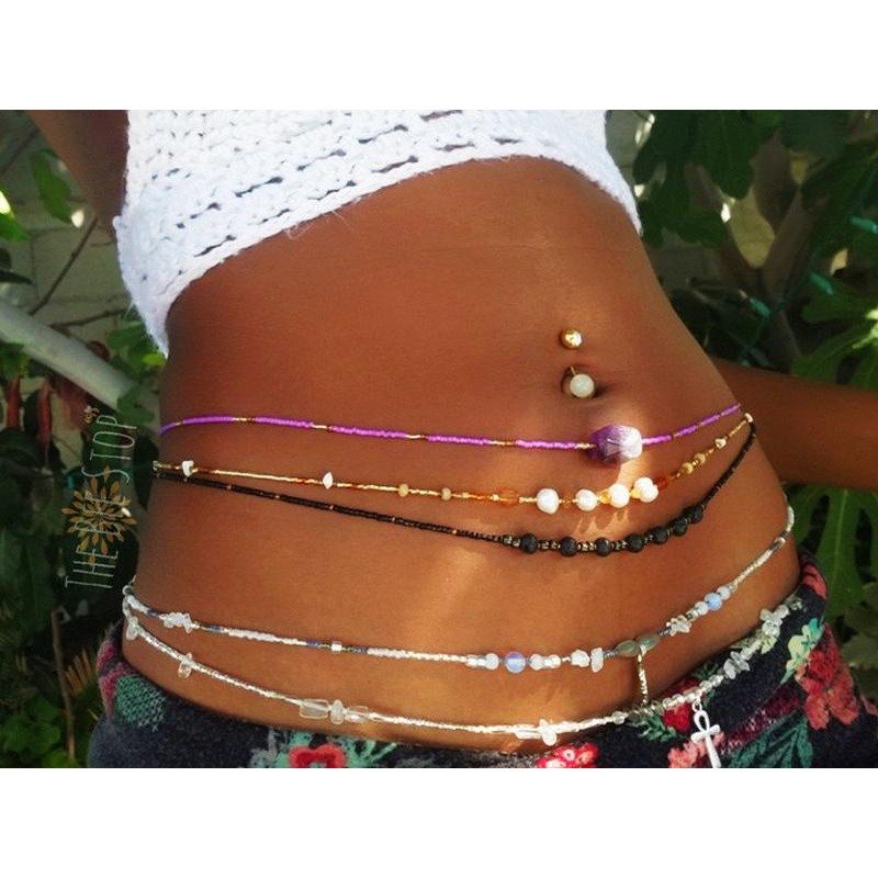 Waist beads are a piece of jewelry worn around the waist or hip area. Originating in Africa, waist beads are traditionally worn by women as a symbol of waist size, beauty, sexuality, femininity, fertility, well-being, and maturity.