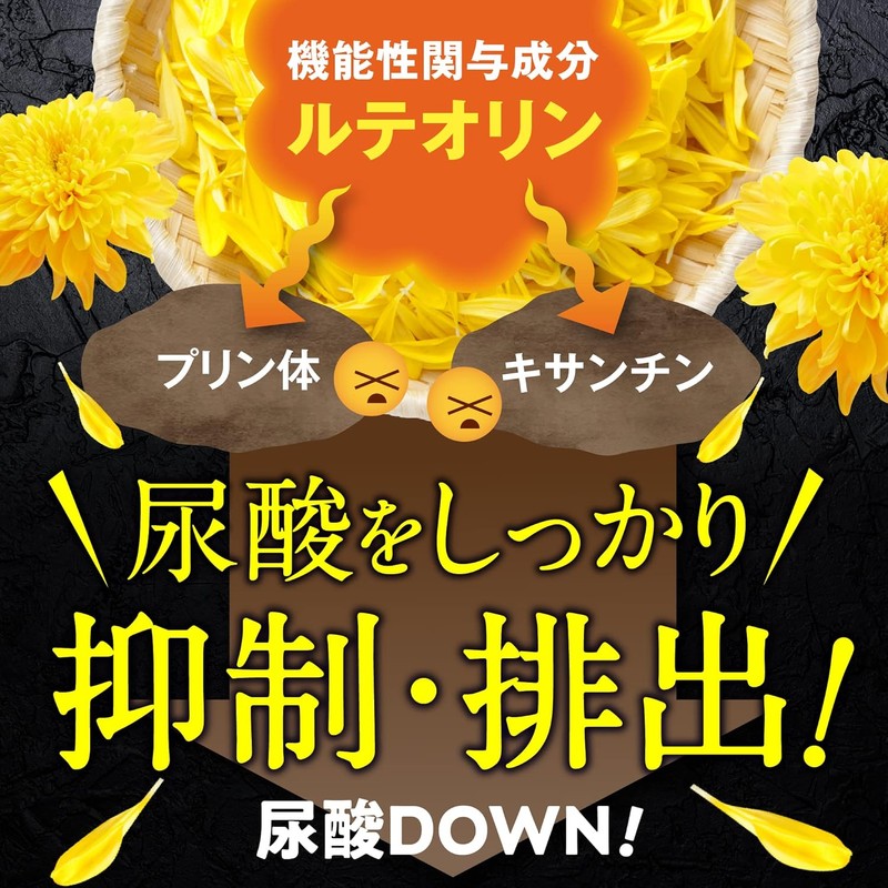 - Functional Food Chrysanthemum Flower & Catechin Blessings (Notification Number G194) Contains luteolin, which has been reported to lower uric acid levels in people with high uric acid levels (over 5.5mg/dL to under 7.0mg/dL). In addition, it contains gallate-type catechin, which has been reported to reduce abdominal fat (visceral fat, subcutaneous fat) in people who are prone to obesity, support weight loss, and lower a high BMI. This is a functional food that contains four types of Japanese and Chinese support ingredients.