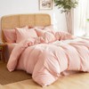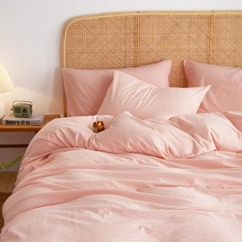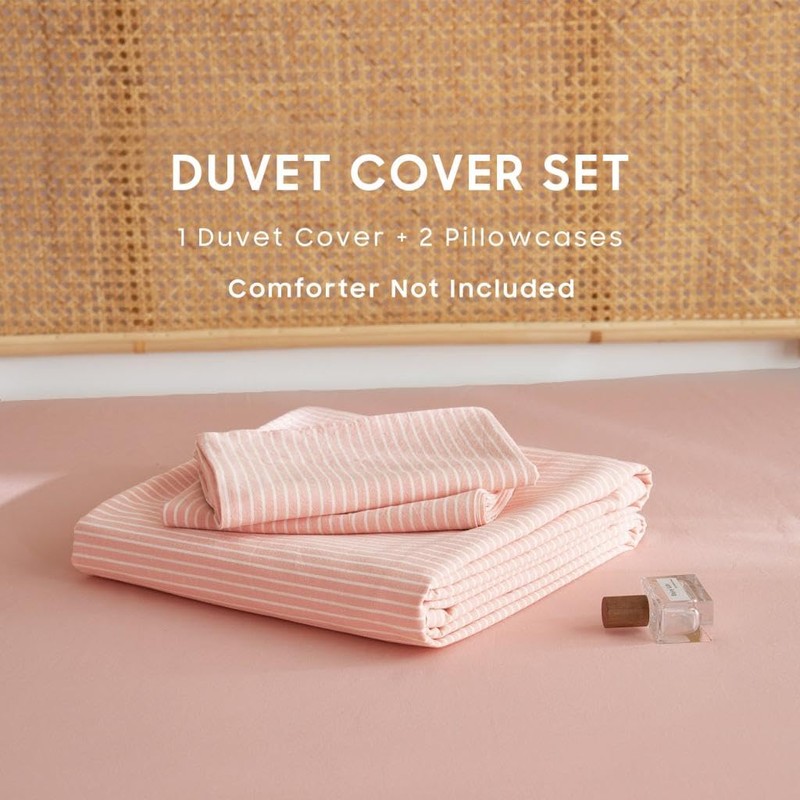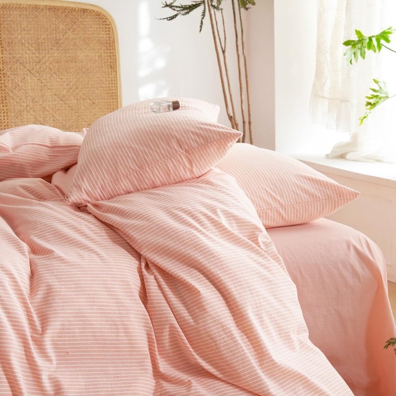Wake In Cloud - Striped Cotton Duvet Cover Set, 100% Washed Cotton Textured Percale Bedding Set, Ticking Stripe Pinstripe Farmhouse, 3 Pieces, Light Pink, Full Size
