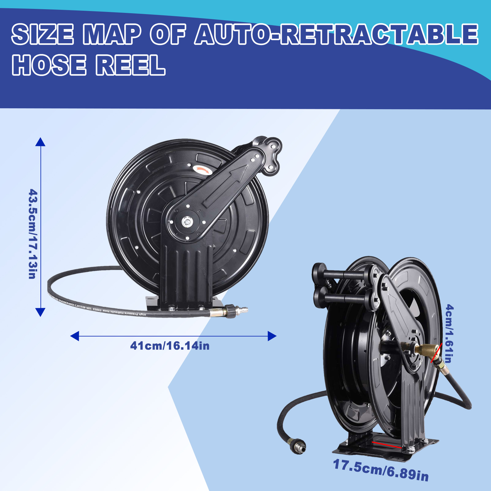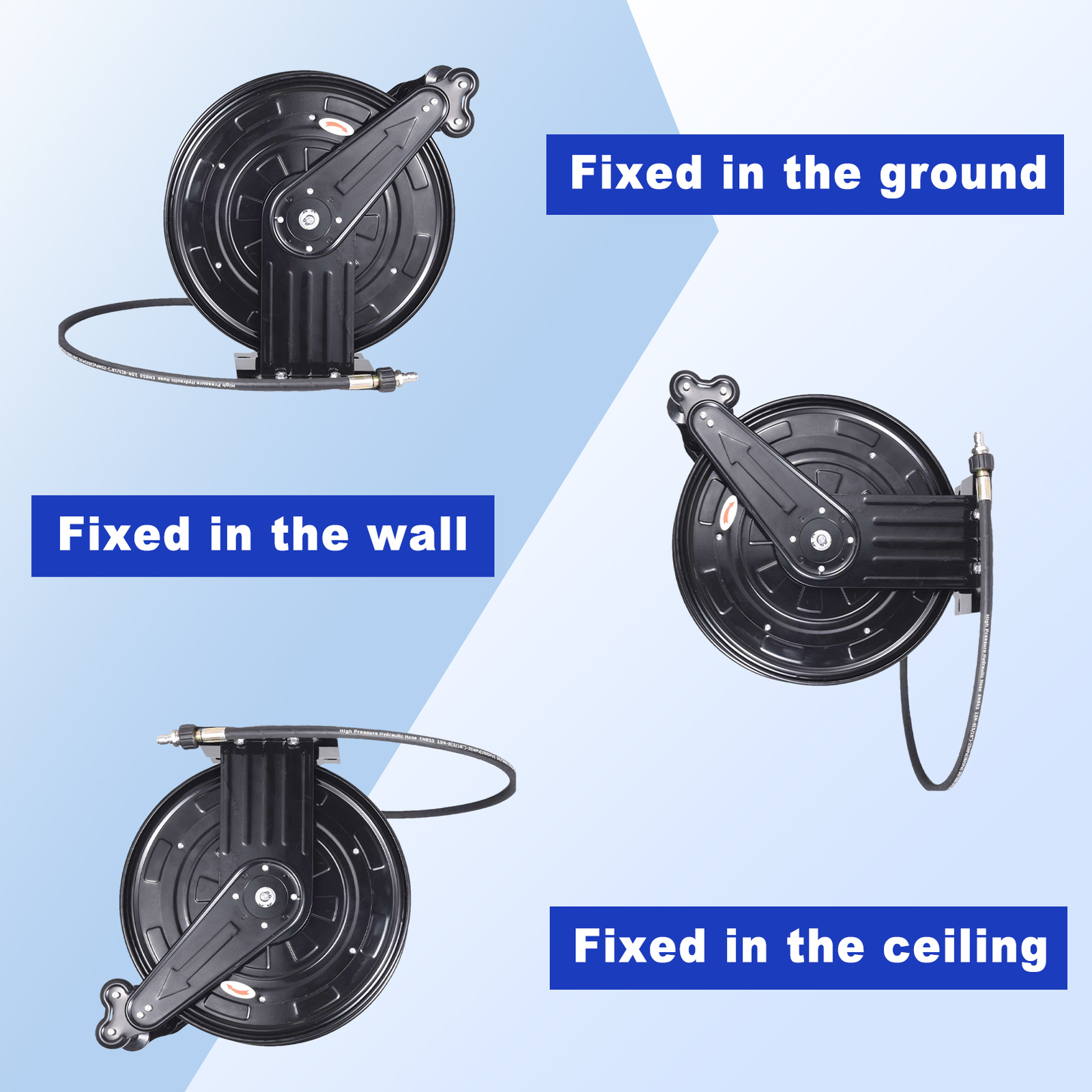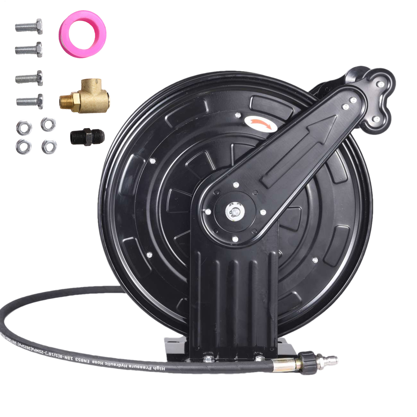 Innovative Solution: Our Washer Hose Reel presents an exclusive solution for your cleaning needs, with an automatic hose retraction system that eliminates tedious manual winding. Its unique design and retractable spring drive mechanism ensure effortless operation.
