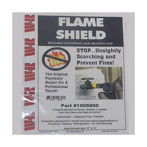 Wal-Rich 1905000 Flame Shield Reusable Soldering And Brazing Pad, approximately 12" x 12", specially designed to stop unsightly scorching and prevents fires. The originals plumbers helper for a professional touch. This pad protects painted surfaces, woods, or metals from the flame and heat of a torch. This shield is lightweight, its asbestos free, and it's flexible. Ideal for retrofit and new piping applications in plumbing, heating refrigeration, and air conditioning.