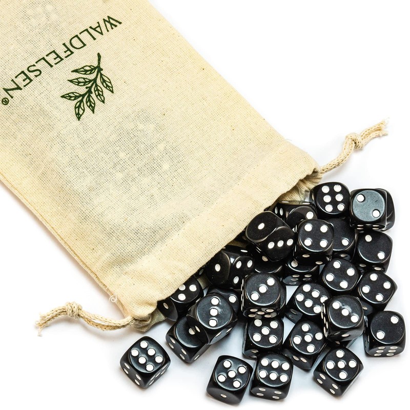 Waldfelsen 6, 12, 20, 30 or 50 High Quality Dice Standard Size 16 mm Acrylic Dice Puzzle Game Cube Dice 6-Sided Six Sided Game Accessories Set with Fabric Bag (Black, 50 Pieces)