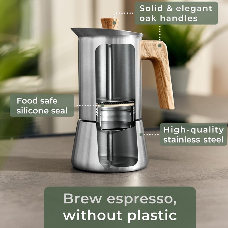 WALDWERK Stainless Steel Moka Pot (10oz) - Toxic Free Moka Pot with Oak Wood Handle - Stovetop Espresso Maker - Italian Coffee Maker for Stovetop and Induction