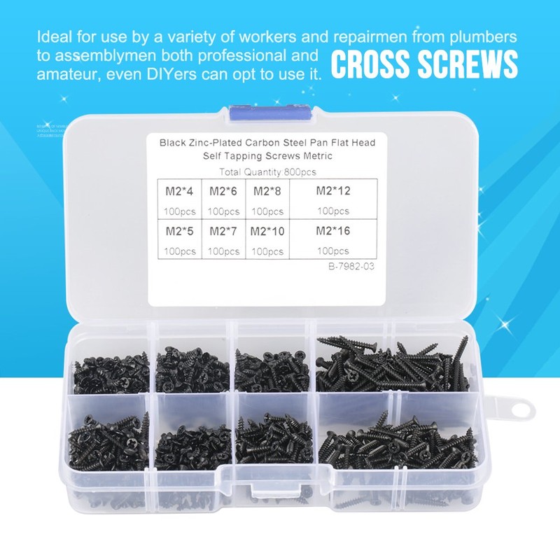 Walfront M2 皿ネジ タッピング インチネジ ミニビス 800個/セット M2 ネジ クロスドライブ フラットヘッド セルフタッピングネジキット 木工用ファスナー ボックス付き (#2)