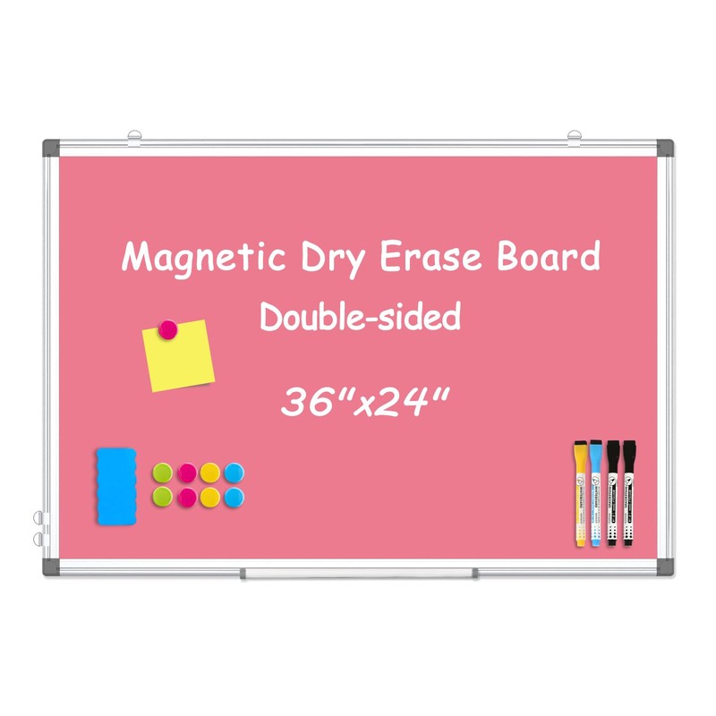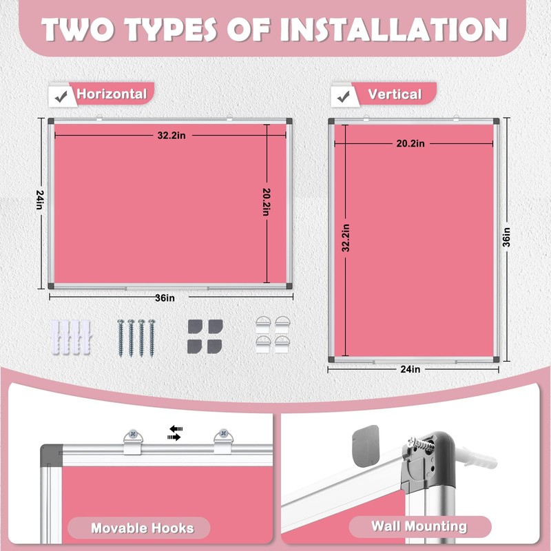 - 【Super Value Package】The 36 X 24 inches dry erase pink board comes with 4 magnetic dry erase markers, 8 magnets, 1 movable tray, 1 dry eraser.You can choose to mount the dry erase board firmly on the wall with the 4 movable hooks or 4 wall screws & 4 anchors covers.