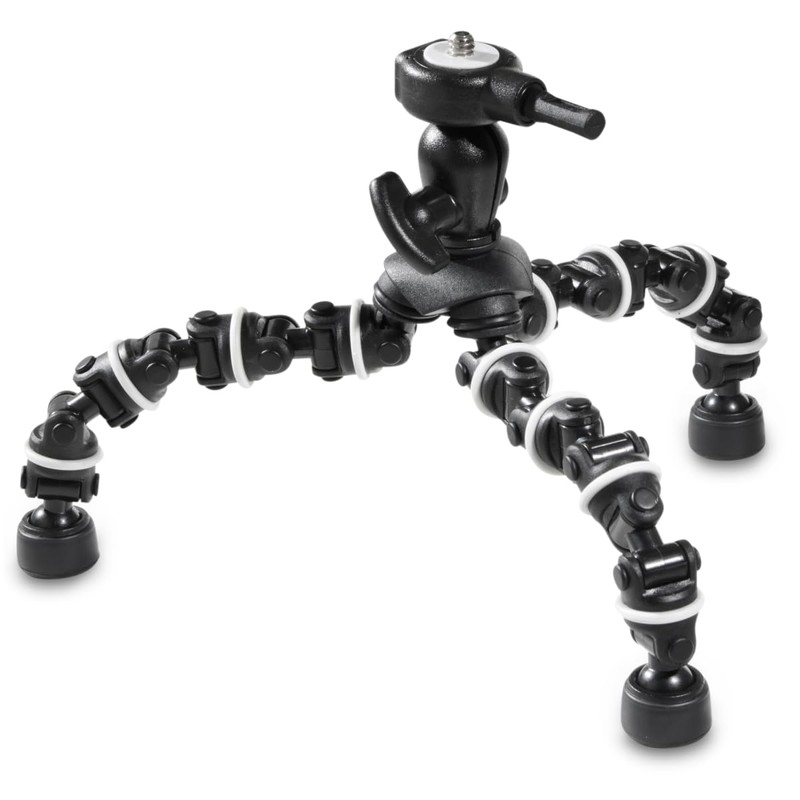 The Multiflex Tripod is namely more than a tripod in mini format. With its seven joints per leg, it is high-grade flexible and bendable and can adapt to every branch, fence and stairrail as well as every situation. Even as normal table tripod, it provides grip and stability thanks to the rubber feets. The quick-release plate with 1/4 inch connection offers the accustomed connection for your compact camera. The small carrying sizes of the little spider monkey have moreover the advantage that it fits in every small pocket.
