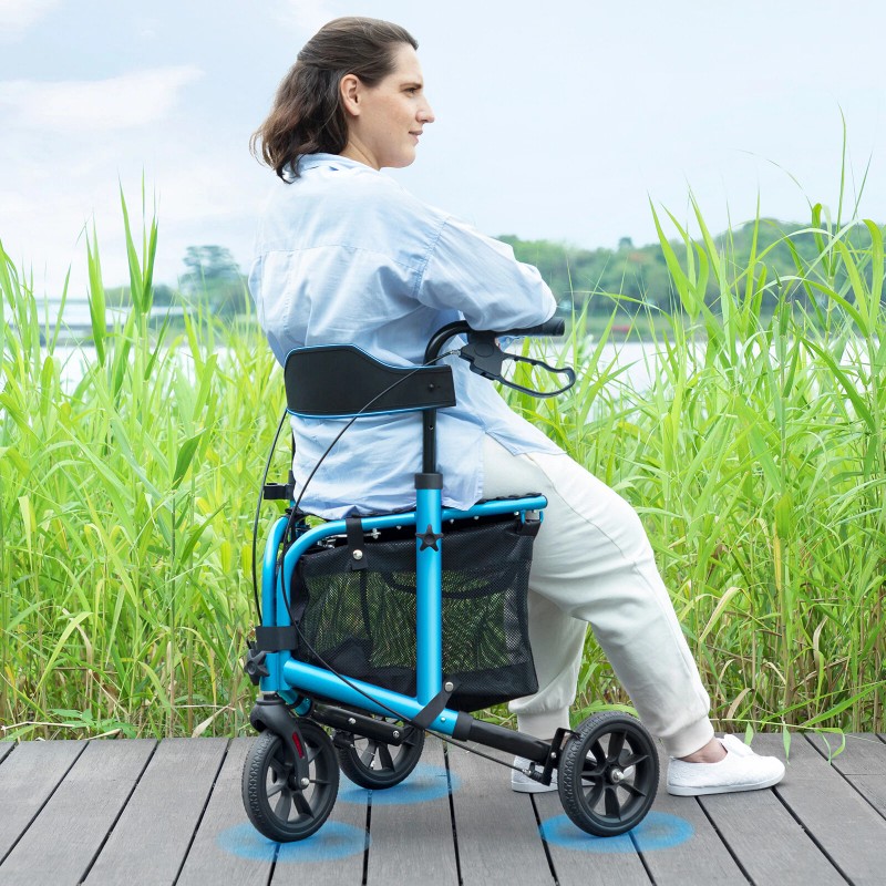 - 【Upgraded 3 Wheel Walker with Seat】The padded backrest and breathable mesh seat will provide you with a comfortable rest when you are tired of walking outside. The seat is designed with a locking device to ensure your safety - pull backwards the black strap at the front of the walker to lock it in place.