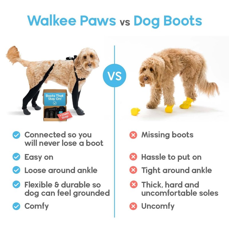 - WE GUARANTEE YOU'LL NEVER LOSE A DOG BOOT AGAIN! All 4 leggings connect together, so booties don't slip off and get lost. Thanks to our all-in-one over-the-back design, Walkee Paws dog shoe leggings secure comfortably over your dog's back and don't squeeze around their ankles.