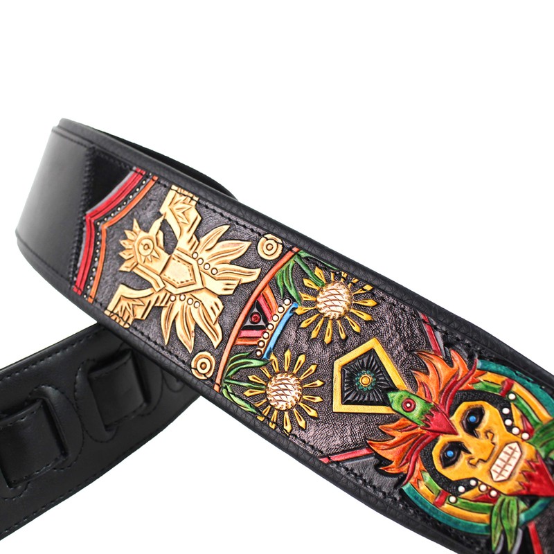 Brand new for us here at W&W is our World Heritage Line. We are hand tooling fantastic new and classic designs from countries around this beautiful planet of ours. Our designs will include our takes on traditional artwork and symbols of heritage. We have hand made each one with skilled leather craft and intricate paint jobs. We think everyone should be proud of their heritage and we want you to be able to show it on the beloved guitars you rock. We are very happy with the designs and work we put into these straps. We are sure you will be happy about these new models we have for you as well.KB-50-BLK Black Strap W/ Multicolor Mayan Design on Black Carved LeatherBlack Top Welt With Full Nose Premium Carving LeatherSuper Comfortable Padded Glove Leather BackHand Carved Multi Colored Mayan DesignSemi Gloss Black Design BackgroundMatching Top Stitching3" wideLong Taper NoseAdjustable from 40"-55"