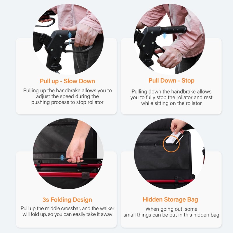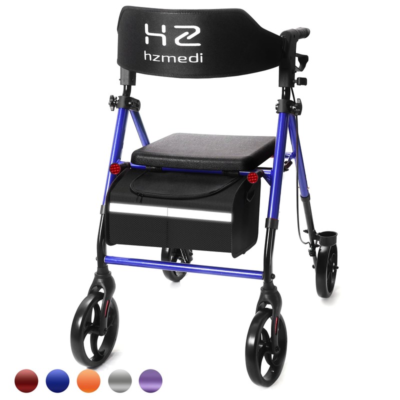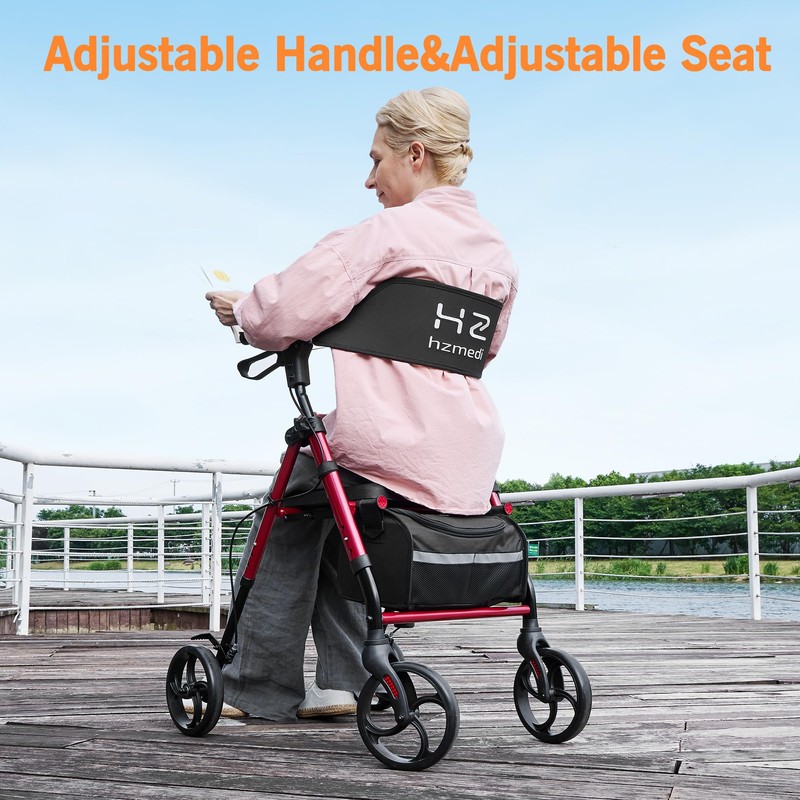 - [Stable and Strong Walkers for Seniors]:Hzmedi walkers for seniors is equipped with soft seats and backrests, and a large storage bag(13.6L) . Pull up the brake handle to pause. If you need to sit down and rest, please press down the brake handle.