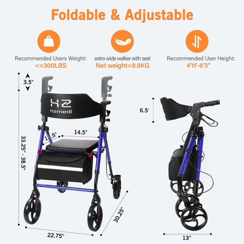 - [Portable Rollator Walker]: HZ walkers for seniors weight only 18.8lb, the size of the seat is 14.5"x12.5", easy to install and disassemble, both seat and armrest heights can be adjusted, the height of the backrest varies with the height of the armrests.