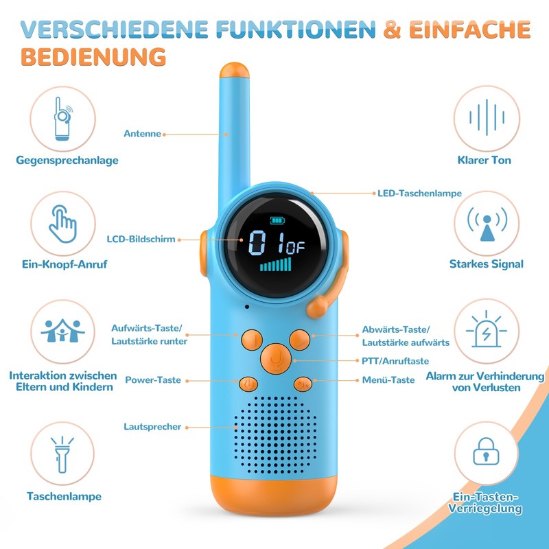 - Easy for children to use: the children's radio has a simple push to talk button, so that our toys are easy to use for children aged 3 and over. With the VOX function, your children can use this toy walkie talkie for children hands-free, which is particularly suitable for smaller children. The lightweight body is shaped to fit easily in the child's hands.