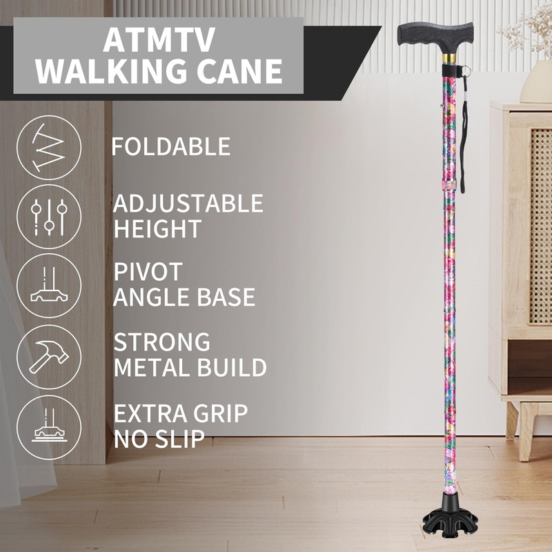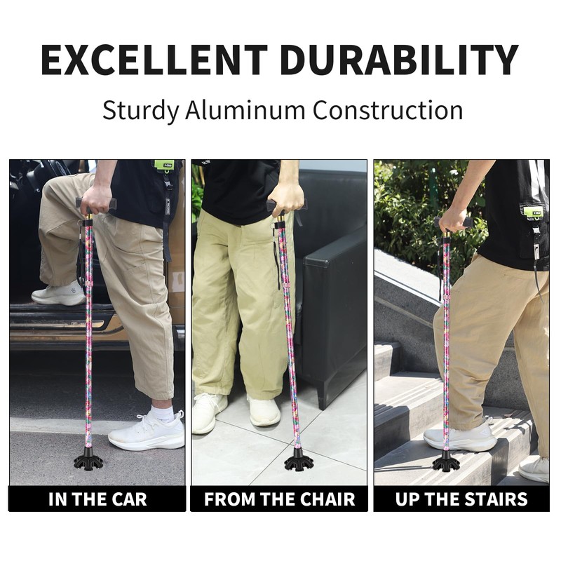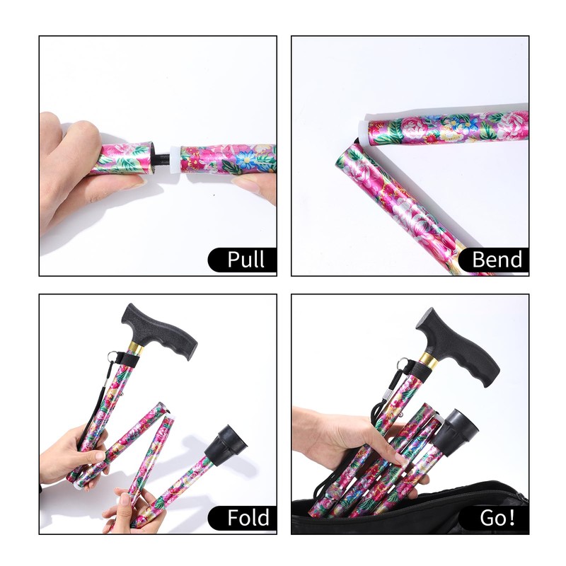 - COLLAPSIBLE& COMPACT WALKING CANE - In order to provide a convenient option for those needing assistance, we develop this folding walking cane. It can smoothly and securely locks in place to provide extra stability while walking on any surface. Ergonomically-designed grip T-handle together provide users with maximum safety and comfort while exhibiting high quality and sustainability. This collapsible cane is compact, easily fitting into a purse, briefcase, carry on or wheelchair bag.