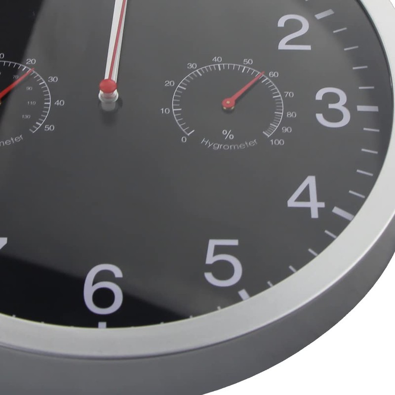 Wall Clock, Silent Movement with Temperature Display and Humidity, Modern, No Ticking Noise, Silent Stainless Steel Frame, Clock for Kitchen, Living Room, Bathroom, Bedroom (Silver + Black)