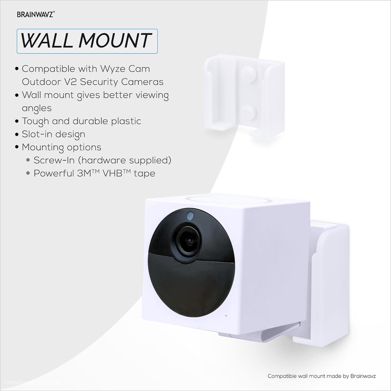 • WALL MOUNT HOLDER: Mounting bracket suitable for Wyze Cam Outdoor v2 1080P Wi-Fi Camera, easy install, screw or stick-on. Mount your camera on any vertical surface for better viewing angles, plus it's out of the way and won't get knocked or accidentally moved. This product is manufactured and designed by Brainwavz, this product is compatible with Wyze Cam Outdoor v2