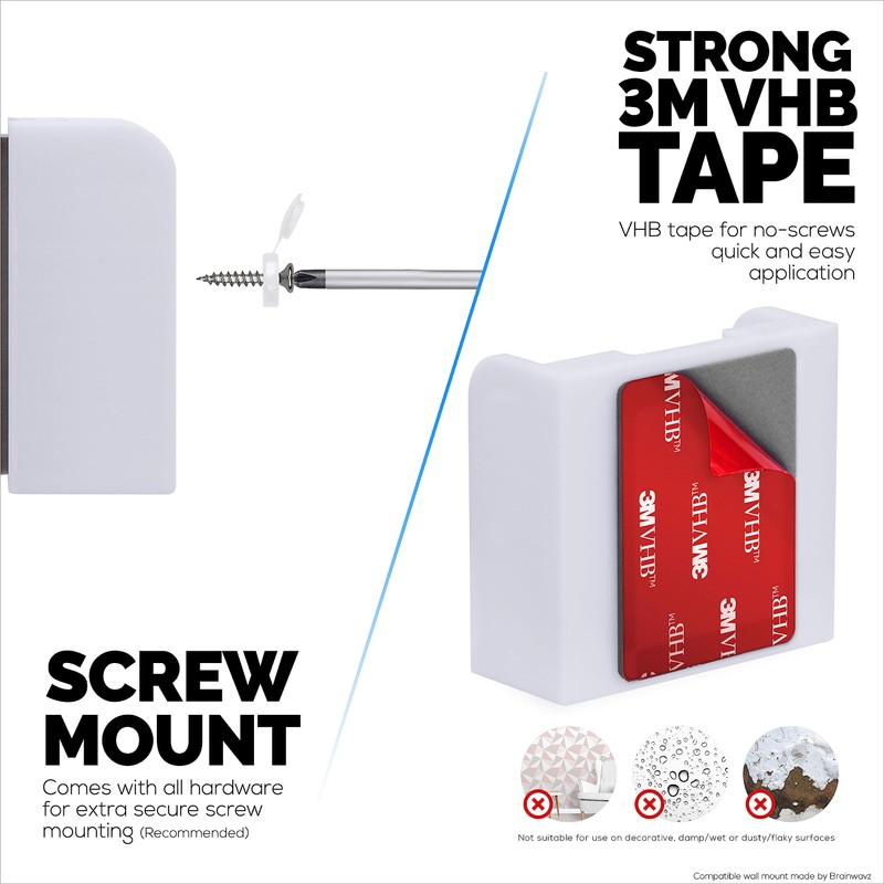• SCREW MOUNT OPTION: All hardware is included so the mount can be screwed into walls and wood surfaces. Includes screws, wall plugs and screw caps
