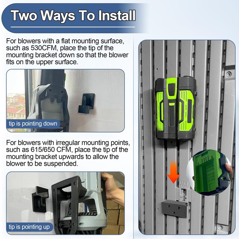 - Holder Wall Mount Installation: Dfnidy's blower wall mount bracket offers two mounting methods and is uniquely designed to hang different models of blowers. For blowers with a flat mounting surface, such as 530CFM, place the mounting bracket with the top facing down so that the blower fits snugly against the upper surface. For blowers with irregular mounting points, such as 615/650CFM, place the mounting bracket with the top of the mounting bracket facing up