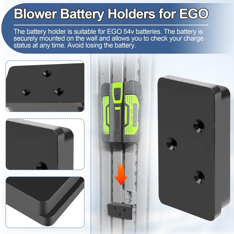 - Leaf Blower Attachments: Includes both 1 leaf blower wall mount and 2 battery holders, and all necessary mounting screws. Battery mounts compatible with EGO 54v battery