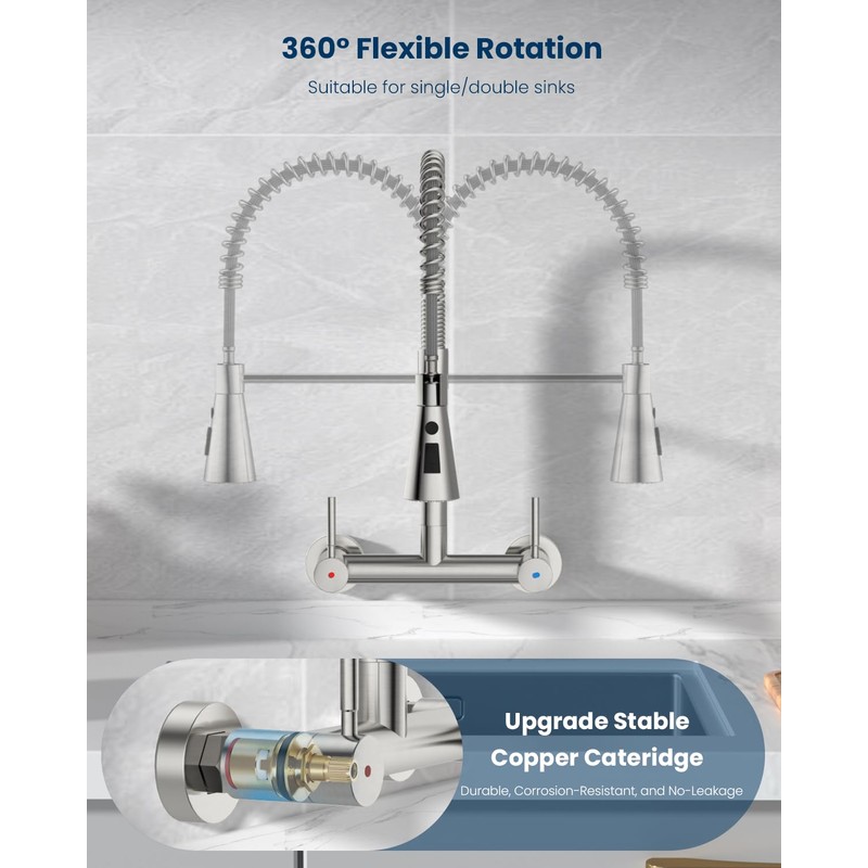 Wall Mount Kitchen Faucet 2 Handles, 8 Inch Center Wall Commercial Utility Sink Faucet with Pull Out Sprayer 3 Modes, Stainless Steel, Brushed Nickel