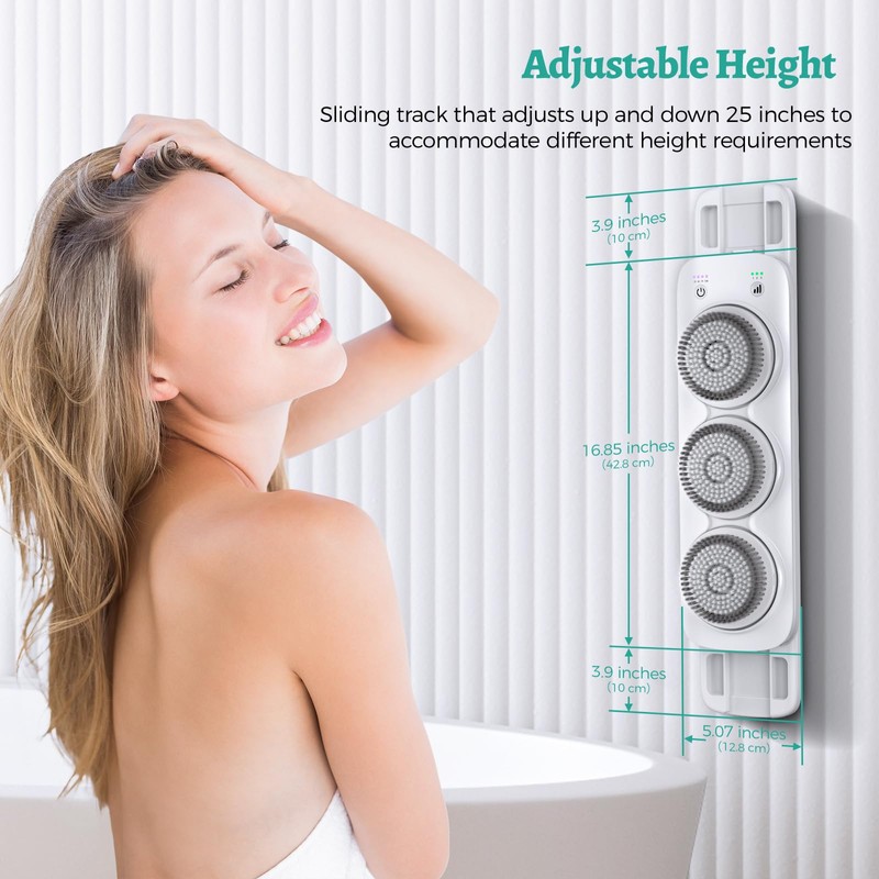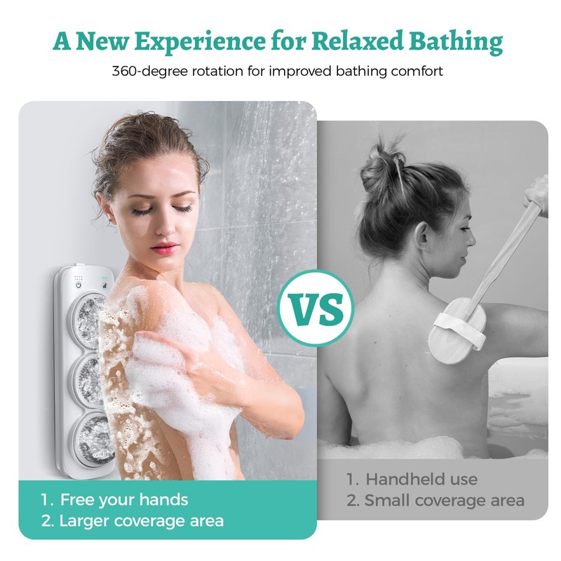 - IPX7 Waterproof:The wall mounted back scrubber for shower is equipped with IPX7 waterproof throughout the body, ensuring safe use for both showering and bathing. It also has an intelligent protection system, When the brush head feels a huge resistance, it will automatically slow down or stop rotating to protect your skin and product safety