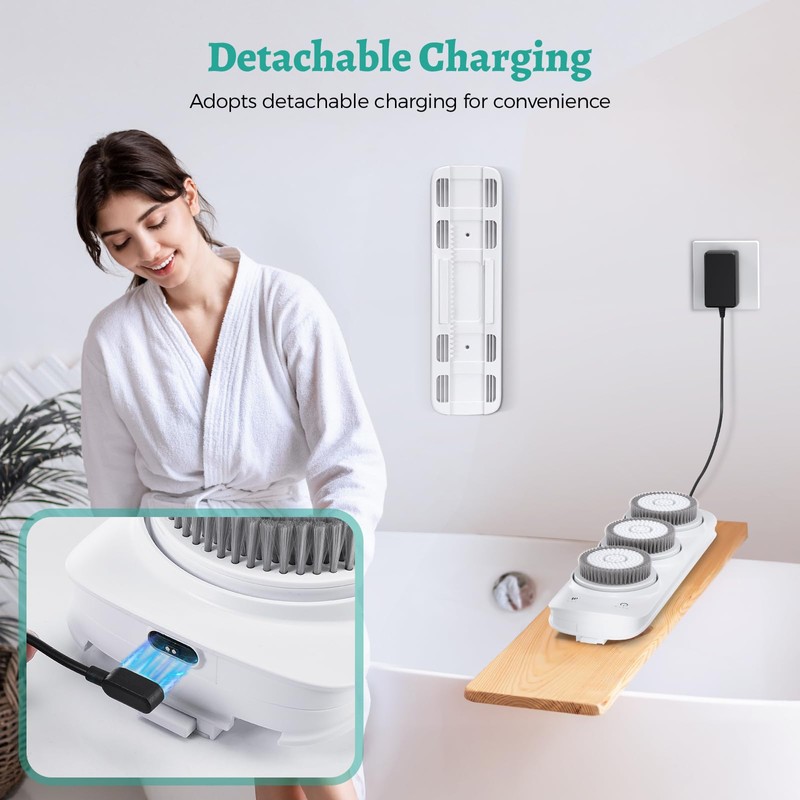 - Easy to assemble: The wall mounted exfoliating brush package comes with an English manual, a 59in long charging cable, glue, screws and other accessories. We have prepared two installation methods for you to choose: you can glue the bottom panel without drilling; you can also use screws to fix the electric back brush to the wall